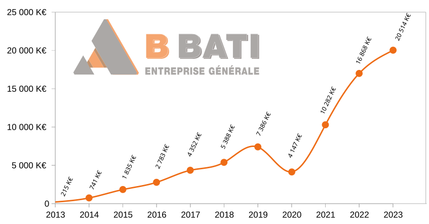 Depuis sa création en 2013, l’entreprise générale B BATI a connu une croissance remarquable de son chiffre d’affaires, témoignant de son dynamisme et de sa capacité à s’adapter aux exigences du marché. En 2013, le chiffre d’affaires était de seulement 215 K€, mais il n’a cessé d’augmenter pour atteindre 20 514 K€ en 2023, soit une multiplication par près de 100 en l’espace de dix ans.
