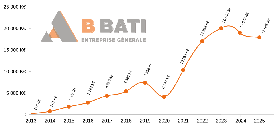 Depuis sa création en 2013, l’entreprise générale B BATI a connu une croissance remarquable de son chiffre d’affaires, témoignant de son dynamisme et de sa capacité à s’adapter aux exigences du marché. En 2013, le chiffre d’affaires était de seulement 215 K€, mais il n’a cessé d’augmenter pour atteindre 20 514 K€ en 2023, soit une multiplication par près de 100 en l’espace de dix ans.